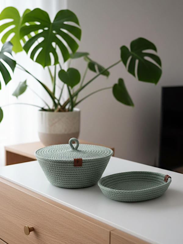 Są takie elementy, które – kiedy występują razem – po prostu mają sens. Koszyk z pokrywką ze sznurka oraz podstawka na biżuterię w kolorze szałwia tworzą spójny zestaw, który pomaga uporządkować codzienne drobiazgi, a jednocześnie wprowadza do wnętrza spokój i harmonię.