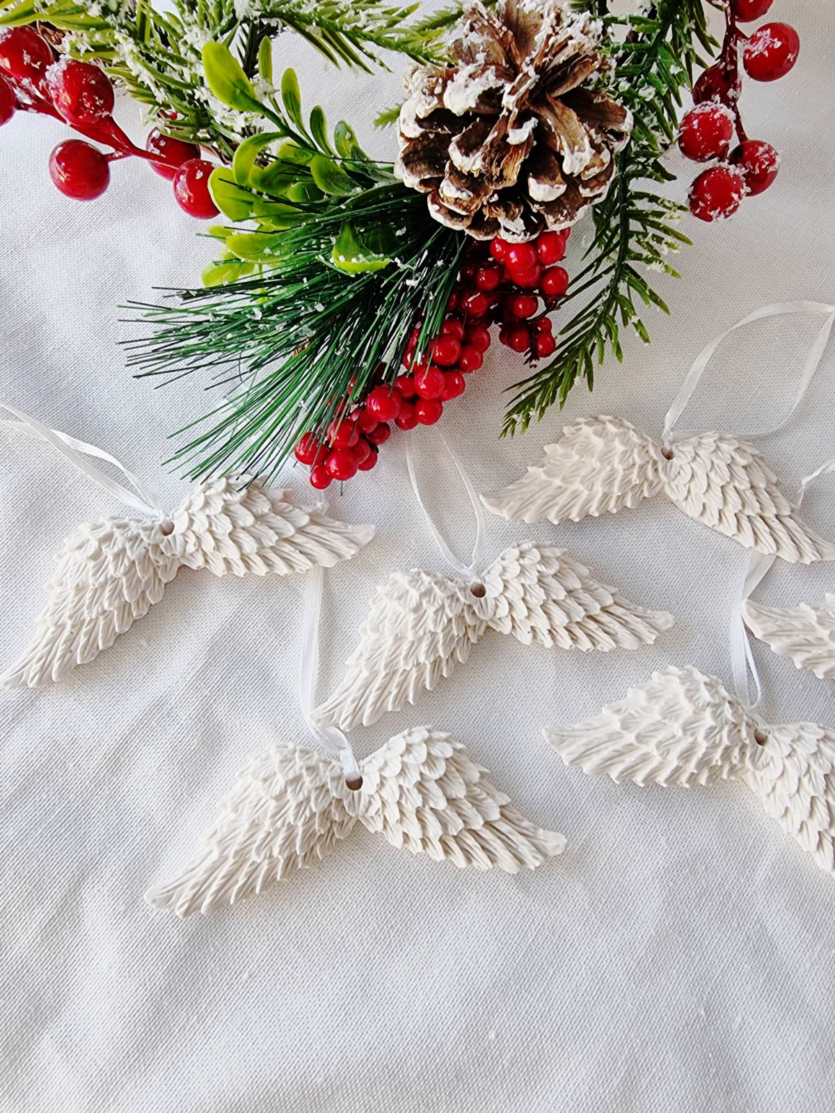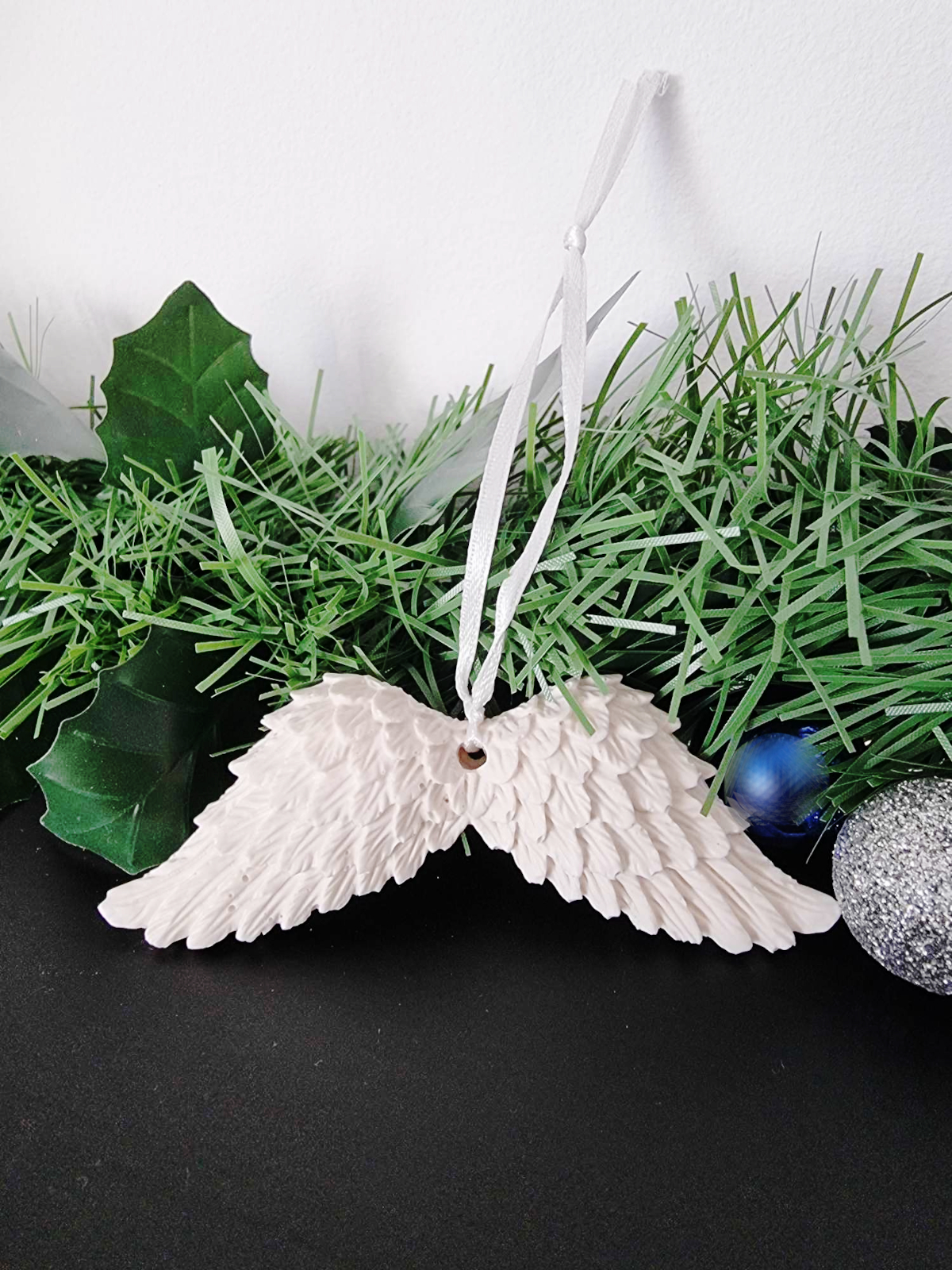 Ozdobne zawieszki skrzydła z gipsu polimerowego stworzone w całości ręcznie – od odlewu, mieszania kolorów, szlifowania po impregnowanie.