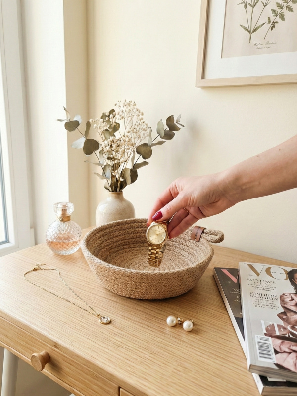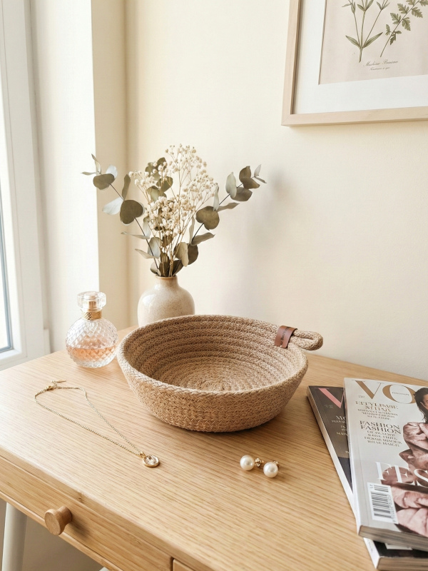 Subtelny odcień beżu, przypominający domowe wypieki, wnosi do wnętrza spokój i naturalną harmonię. Ta niewielka podstawka ze sznurka to praktyczne rozwiązanie dla osób, które cenią porządek w estetycznym wydaniu. Dzięki sztywnej konstrukcji przedmiot nie traci kształtu, stając się bezpiecznym miejscem na biżuterię, zegarek czy klucze tuż po wejściu do domu.