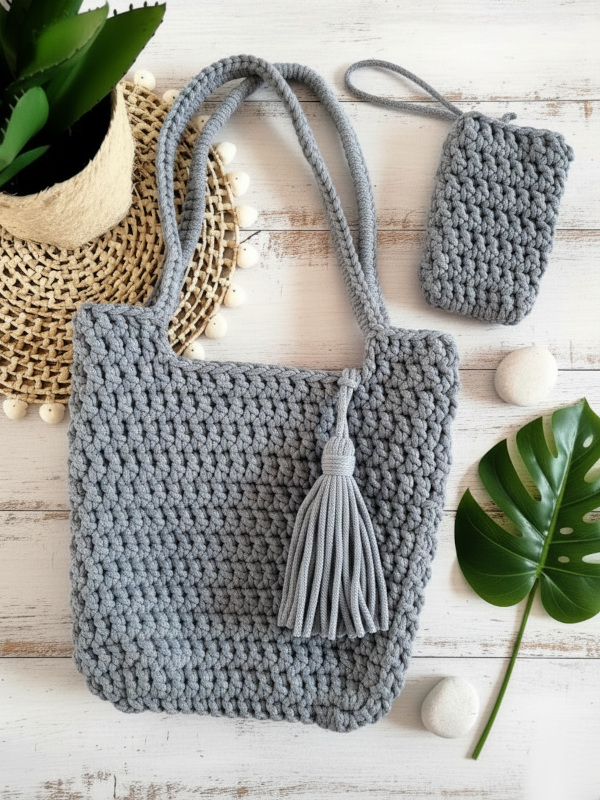 Torba shopperka wykonana ręcznie na szydełku, tworzona na indywidualne zamówienie. Model w kolorze szarym, z bawełnianą podszewką oraz z etui na telefon, okulary lub drobiazgi. Etui można przypiąć wewnątrz torby albo wyjąć i używać osobno.