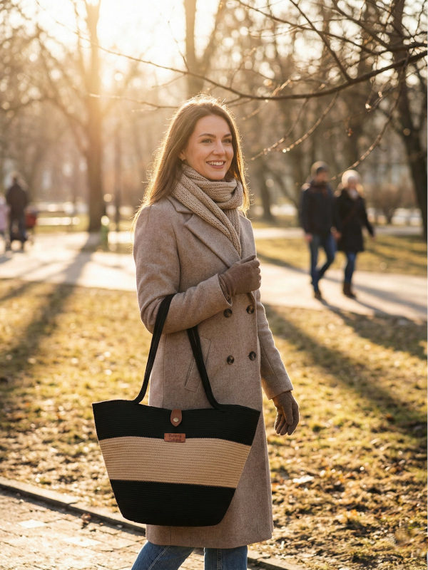 - Wizualny Spokój i Harmonia: W świecie pełnym hałasu i krzykliwych logotypów, prawdziwy luksus szepcze. Połączenie głębokiej czerni z delikatnym beżem to wyraz najwyższej elegancji. To dodatek, który nie dominuje stylizacji, ale ją szlachetnie dopełnia, dając otoczeniu sygnał, że cenisz wyrafinowaną estetykę i przemyślane wybory.
