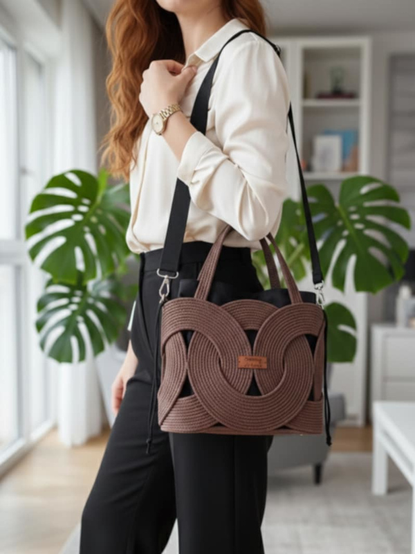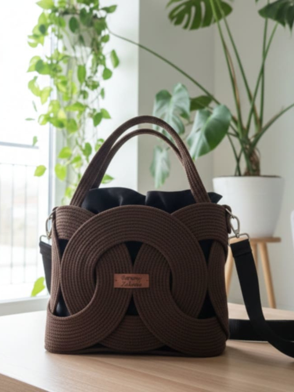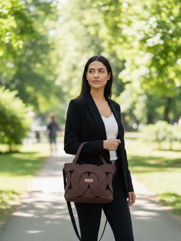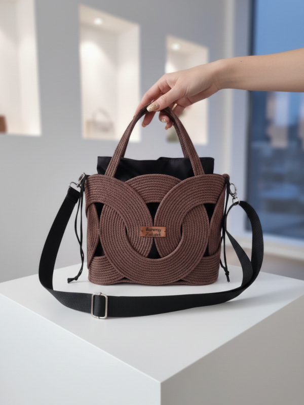 Unikatowy charakter tej torebki to zasługa precyzyjnego połączenia rzemiosła z nowoczesną formą. Każdy splot sznurka został starannie dopracowany, tworząc sztywną, geometryczną konstrukcję, która nie traci fasonu niezależnie od zawartości. Brązowa tekstura w połączeniu z wyrazistym wzorem sprawia, że jest to małe dzieło sztuki użytkowej, obok którego nikt nie przejdzie obojętnie.