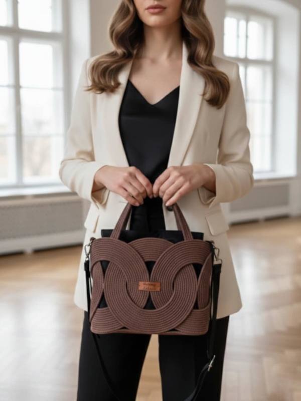 Szukasz dodatku, który przełamuje rutynę i łączy wyrafinowany design z codzienną wygodą? Model „Pierścienie II” w odcieniu brązu (kawa) to propozycja dla kobiet, które w modzie szukają czegoś więcej niż tylko użyteczności. To idealnie wyważona, średniej wielkości torebka, która bez trudu pomieści Twój telefon, portfel, ulubiony planer i niezbędne drobiazgi. To Twój stylowy towarzysz- od biznesowych spotkań po popołudniową kawę w parku.