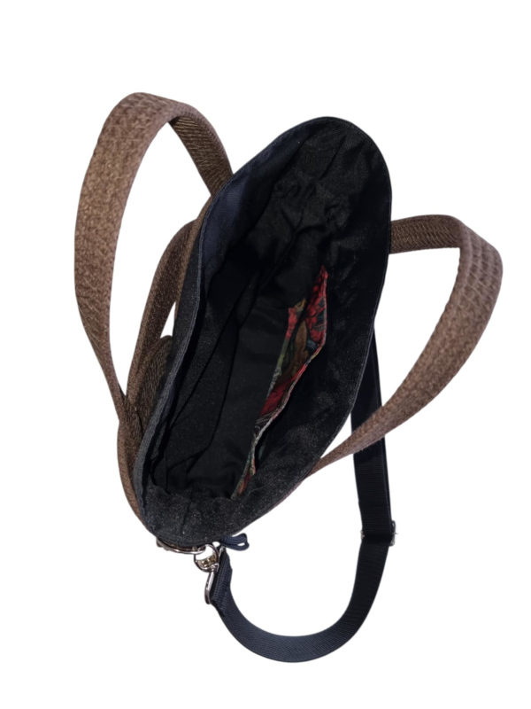 - Kolorystyka: Brąz z czarnymi akcentami (pasek i wnętrze).
