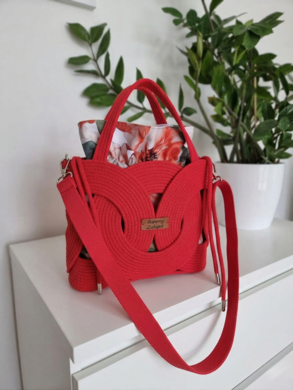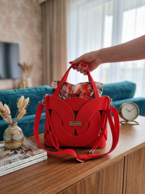 Regulowany pasek parciany i krótkie rączki umożliwiają noszenie w dłoni, na przedramieniu, na ramieniu lub jako listonoszkę, dostosowując się do Twojego stylu i potrzeb. Wnętrze wyposażono w wodoodporny worek w kwiatowe wzory, z podszewką i praktyczną kieszonką na telefon, co ułatwia organizację drobiazgów. Całość uzupełniają srebrne okucia oraz intensywny czerwony kolor, który podkreśla charakter każdej stylizacji.
