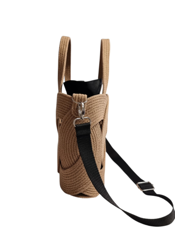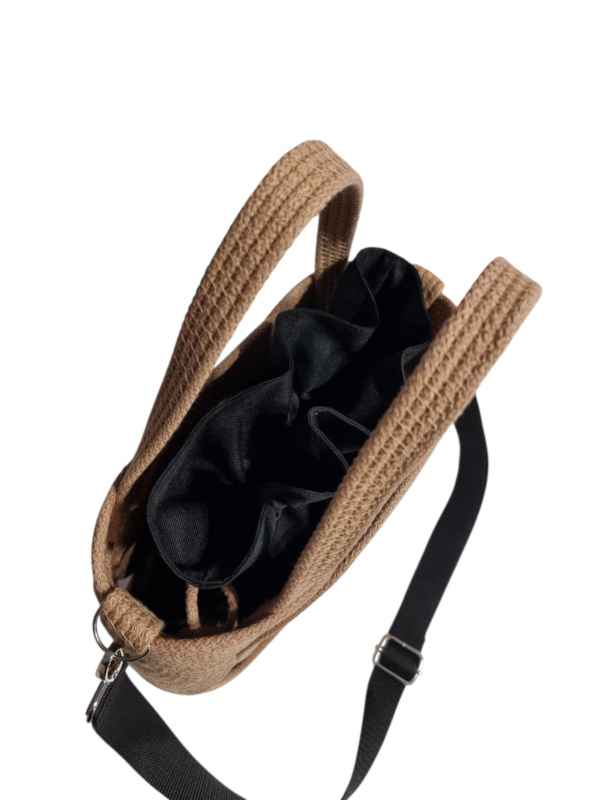 Regulowany, czarny parciany pasek pozwala nosić ją wygodnie na ramieniu lub crossbody. W środku znajduje się wyjmowany, czarny worek z wodoodpornego materiału z otwartą kieszonką – idealną na telefon.